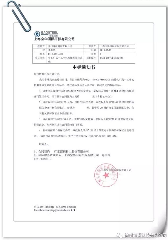 年底收官,销售部捷报来传,矿用除尘器、矿用除尘设备公司成功中标广东韶钢松山股份有限公司特扎厂高一工序轧机微雾除尘系统项目。