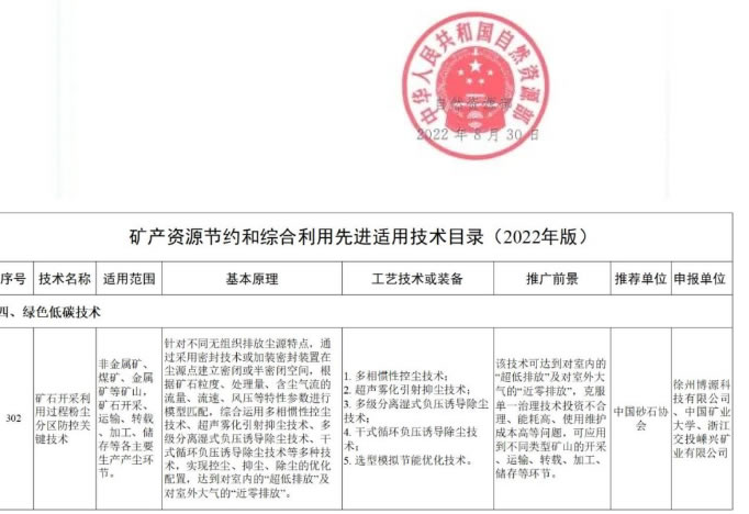 近日,国家自然资源部公告了《矿产资源节约和综合利用先进适用技术目录(2022年版)》, 矿用干式除尘器博源科技主导研发的“矿石开采利用过程粉尘分区防控关键技术”成功入选,这标志着博源科技的科研创新实力与成果转化能力跻身行业前列。